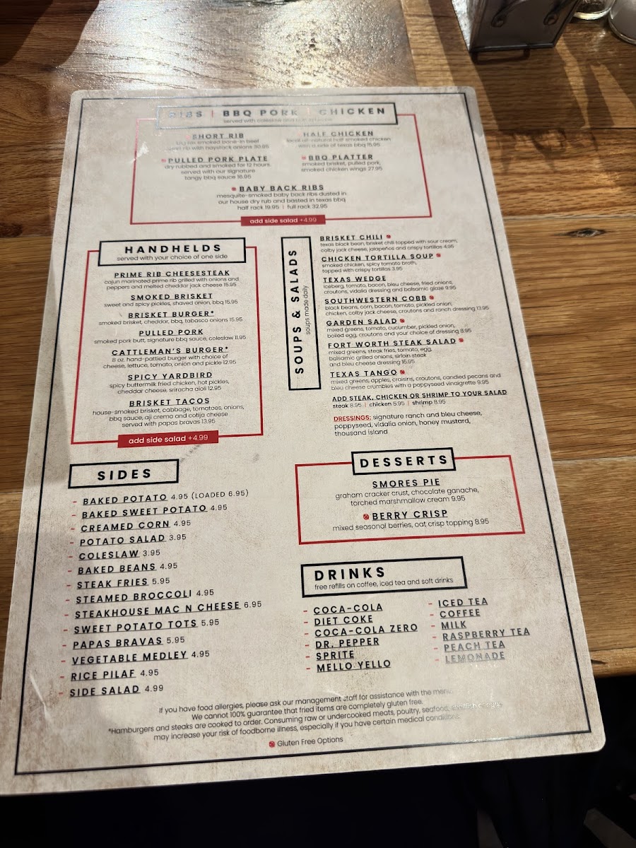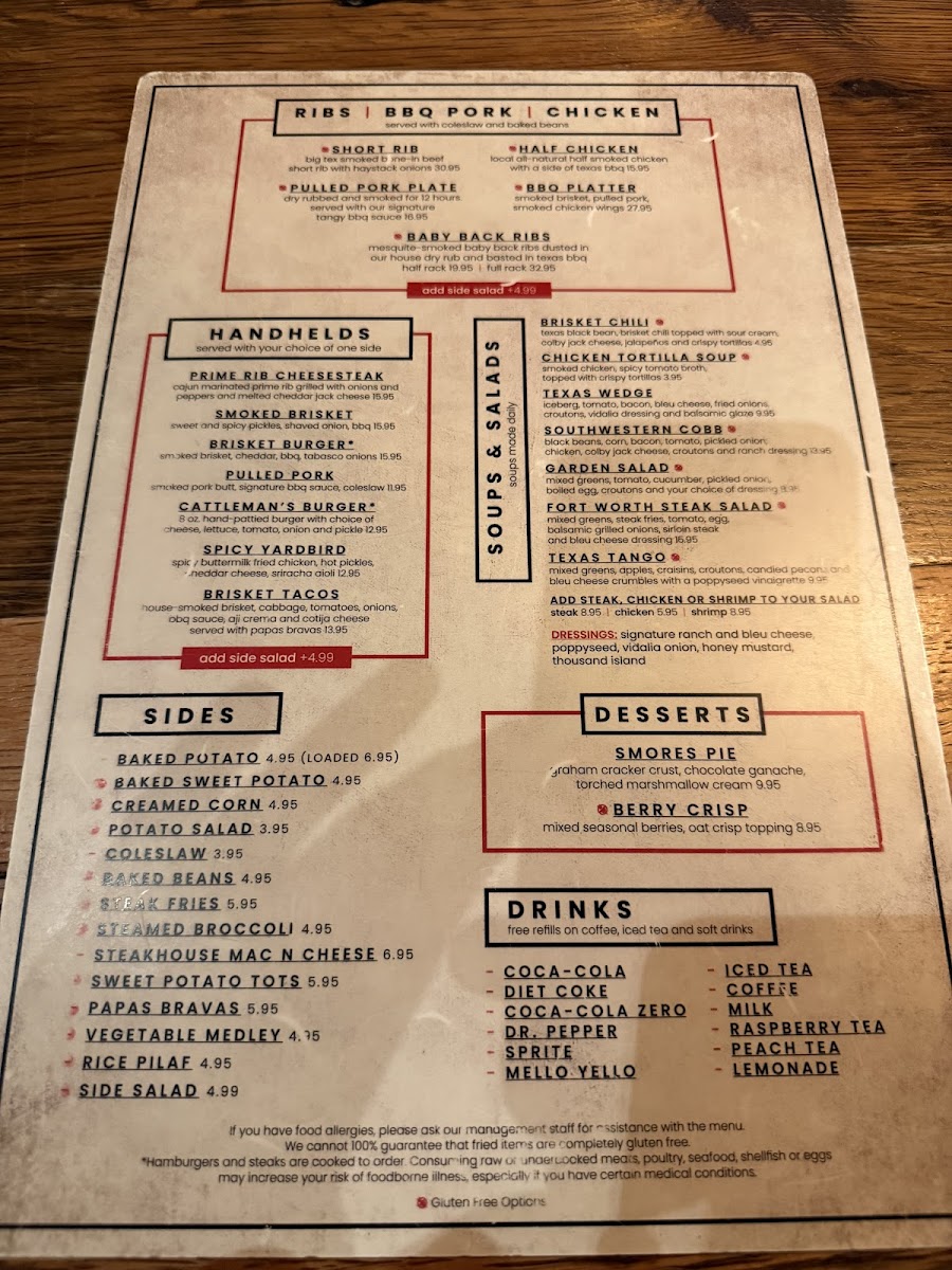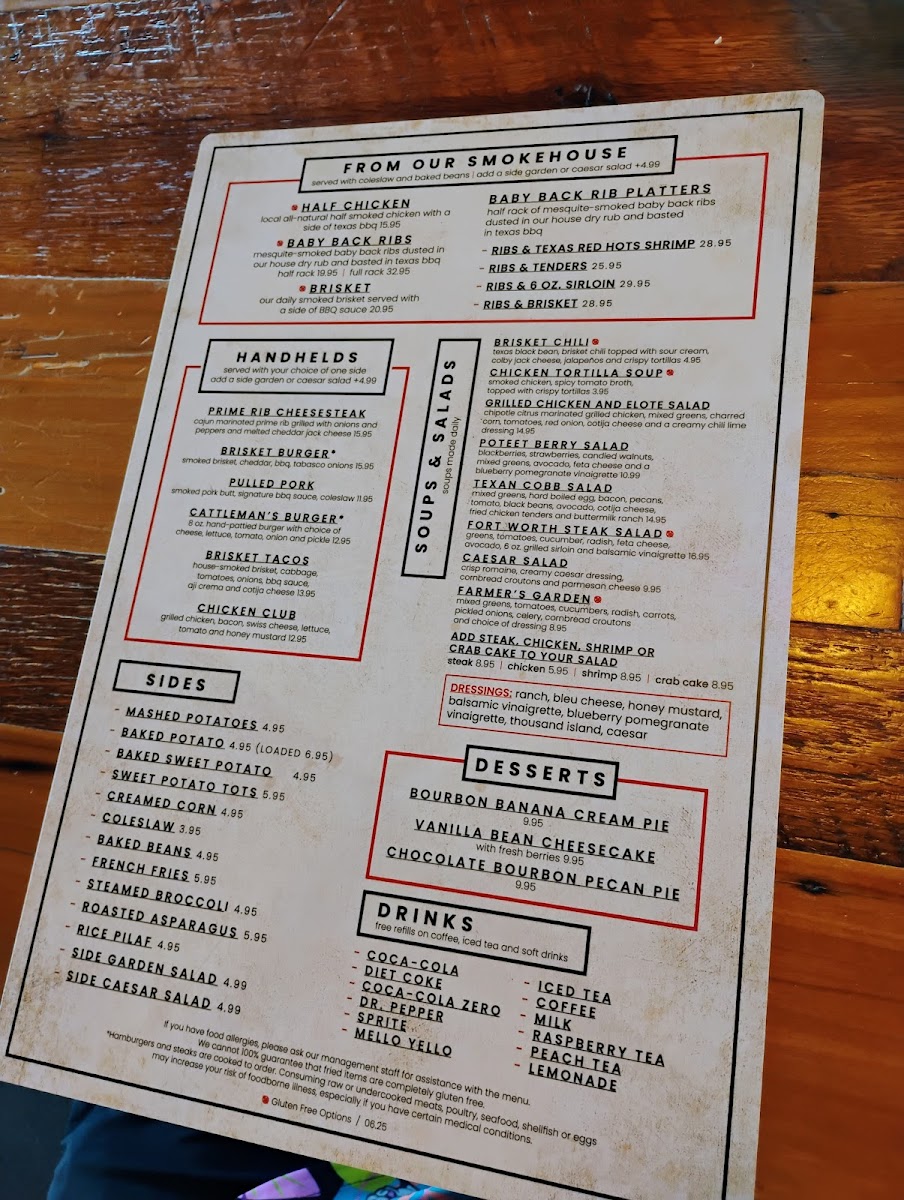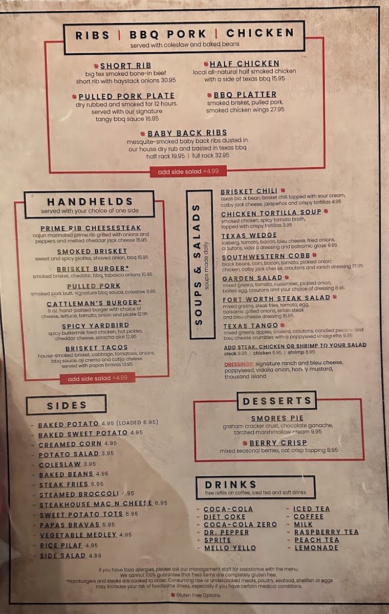 Start your culinary journey with enticing appetizers like the Shrimp Poppers and the standout Onion Ring Tower, perfect for sharing or indulging solo. For those seeking something hearty, the selection of handhelds includes the mouthwatering Ribeye Cheesesteak and succulent Smoked Brisket. Don't miss their delectable soups and salads, including the Fort Worth Steak Salad, which promise to satisfy and refresh.