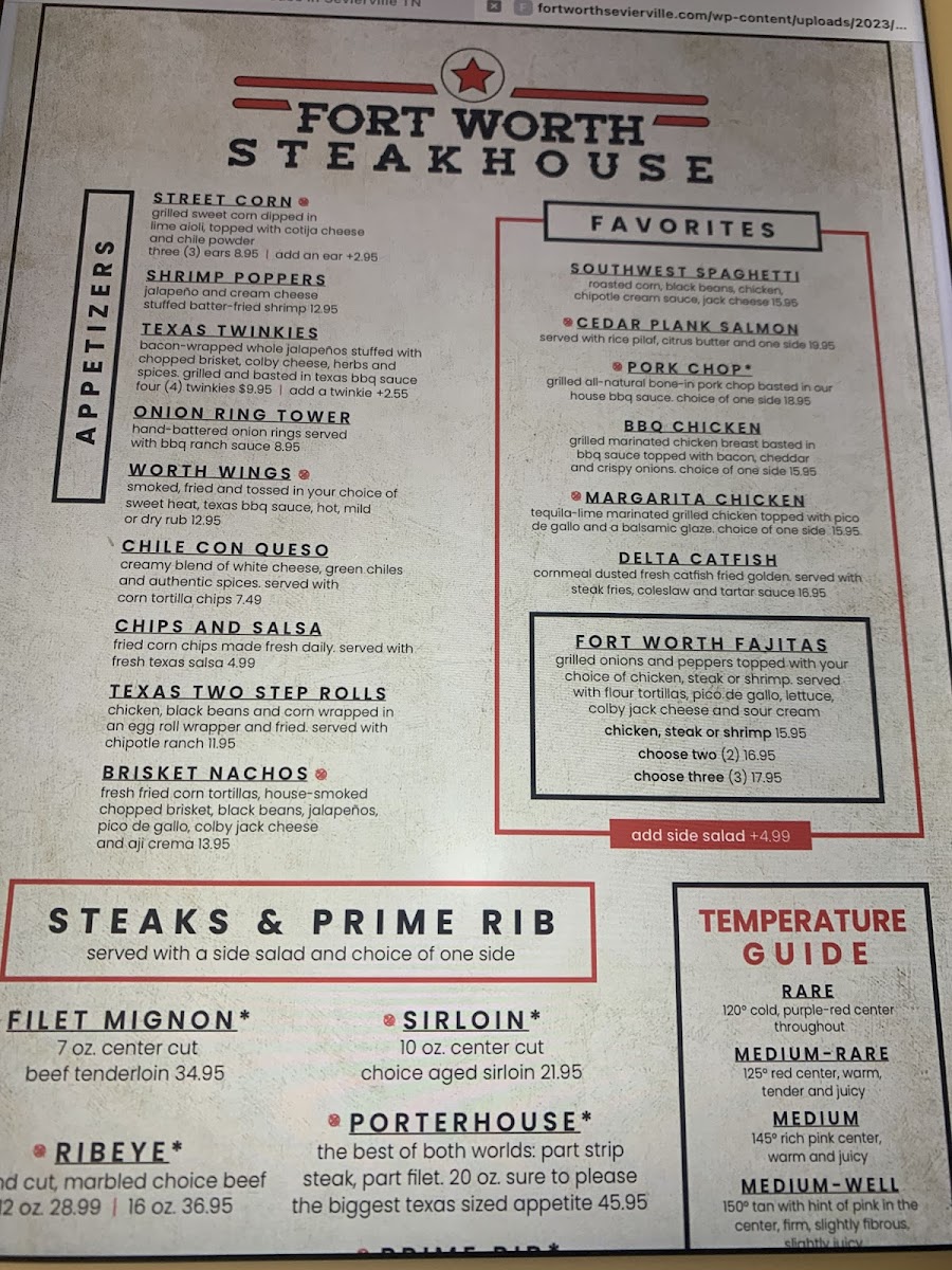 Welcome to Fort Worth Steakhouse, where each dish is crafted to capture the essence of Texan flavors right in the heart of Sevierville, TN. The menu is a vibrant blend of hearty offerings that cater to every palate.